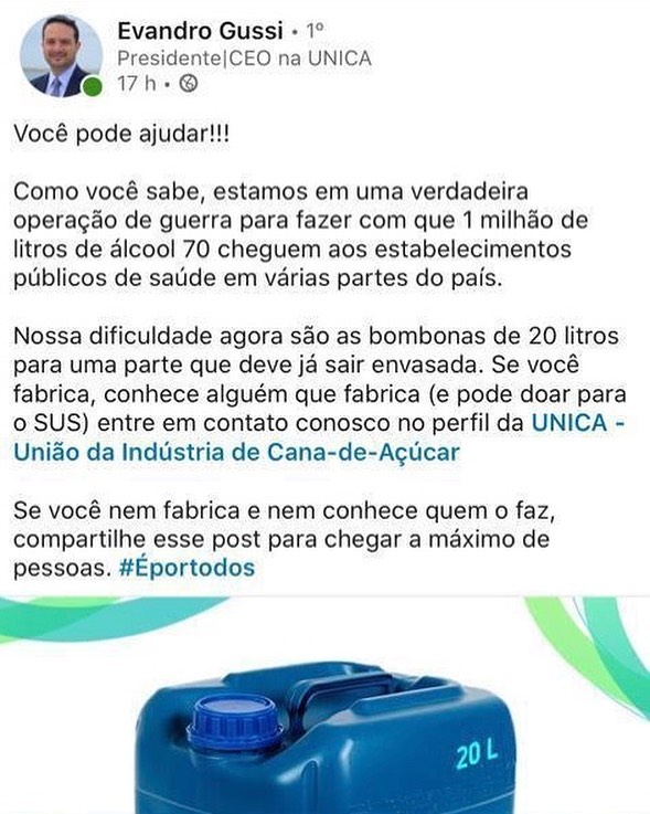 Mas para realizar essa ação que distribuirá o produto nos estados de São Paulo, Rio de Janeiro, Rio Grande do Sul, Espírito Santo, Paraná e Santa Catarina, a UNICA precisa que fabricantes de bombonas de 20 litros doem essas embalagens ao SUS.