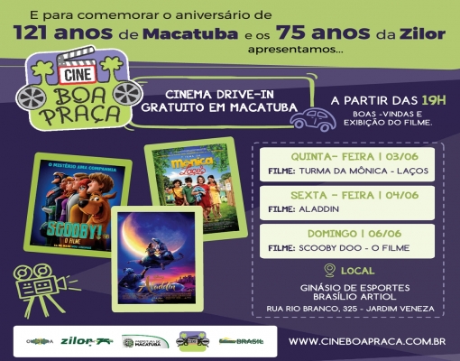 O projeto Cine Boa Praça chega à cidade para celebrar o aniversário de 121 anos de Macatuba. É um presente para a comunidade e faz parte do calendário comemorativo dos 75 anos da Zilor. Programa imperdível para todas as idades, e carangos!
