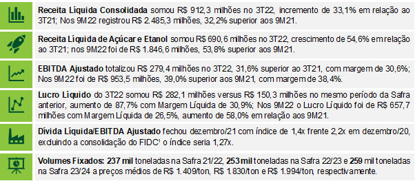 - Investimentos em canaviais e na modernização do parque industrial contribuíram para a obtenção de resultados expressivos, mesmo em meio a um cenário desafiador devido aos impactos climáticos.