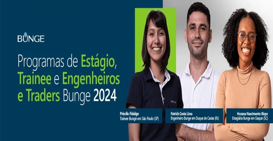A Bunge abre inscrições simultâneas para seus três processos de atração de talentos voltados a pessoas em início de carreira: Programa de Estágio, Programa de Trainee e Programa Engenheiros e Traders Bunge. São mais de 70 vagas distribuídas entre diferentes áreas da companhia, em diversas regiões do país. – confira os detalhes abaixo. Interessados devem se inscrever pelo site até 14 de setembro de 2023.