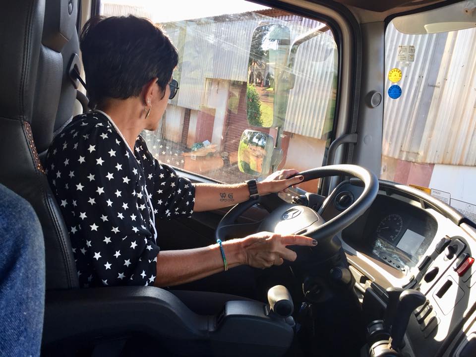 Durante o Encontro Cana Substantivo Feminino as mulheres participam de test-drives com caminhões e tratores