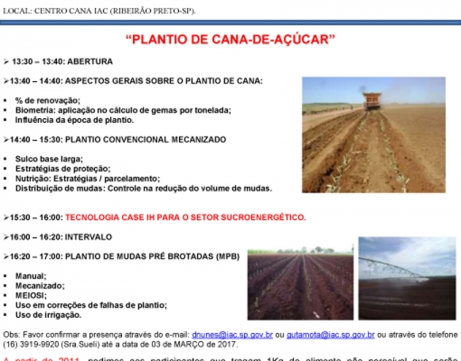 Estamos iniciando mais um ano de atividades e socializações de informações e conceitos através do Grupo Fitotécnico IAC. Neste sentido estamos encaminhando em anexo o convite da 1ª Reunião que irá ocorrer no dia 07 de Março as 13:30 horas aqui no Centro de Cana IAC em Ribeirão Preto-SP que abordará como tema principal “Plantio de cana-de-açúcar”.