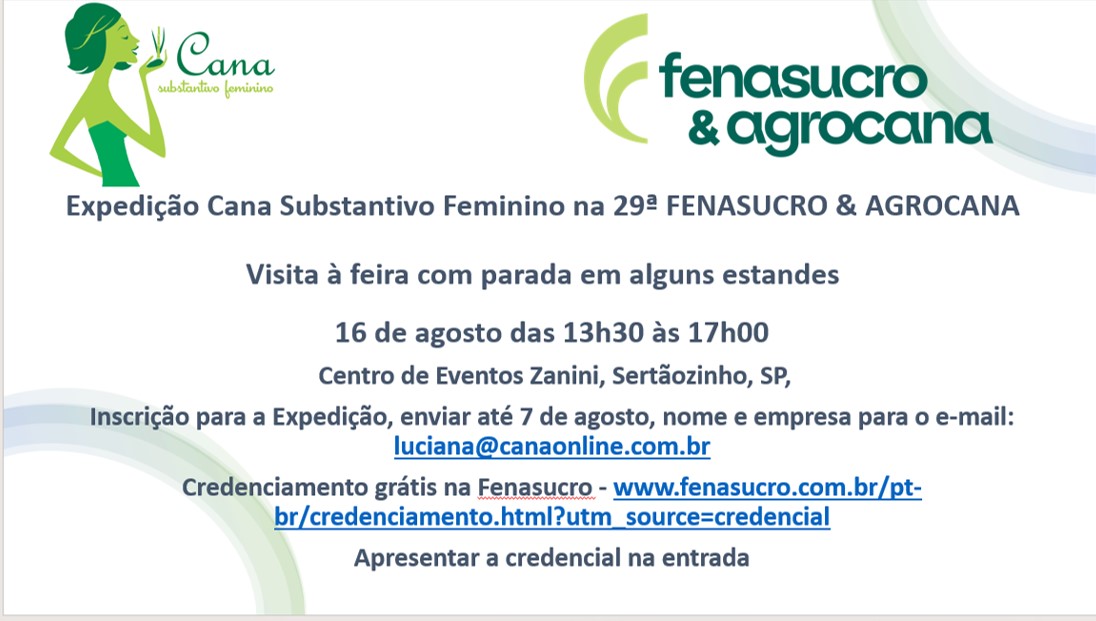A 29ª Fenasucro & Agrocana acontece de 15 a 18 de agosto no Centro de Eventos Zanini, Sertãozinho, SP, e a Expedição Cana Substantivo Feminino será em 16 de agosto das 13h30 às 17h00