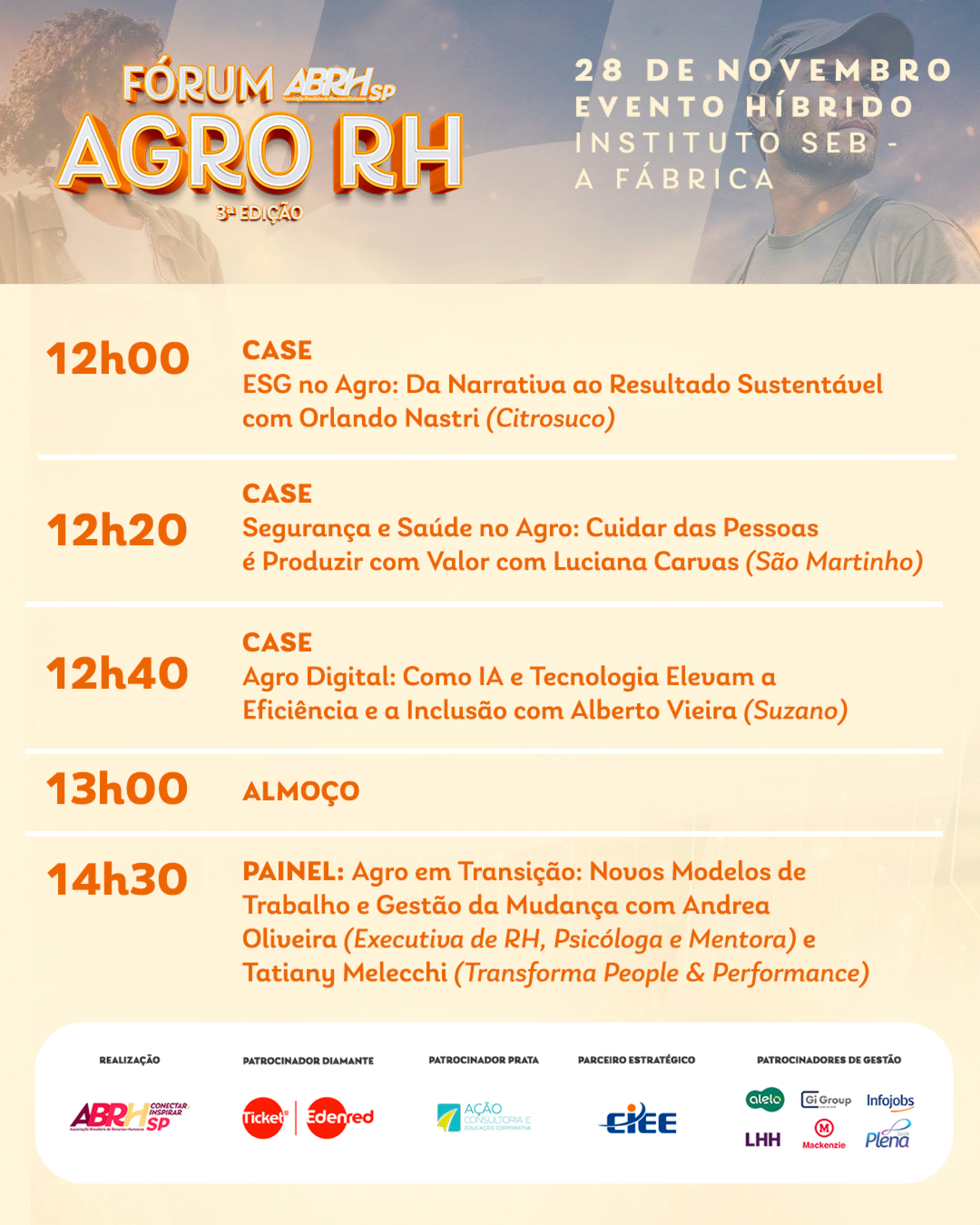 Vem aí a 3ª Edição do Fórum Agro ABRH-SP “Transformação Humana e Inovação no Agro: Construindo o futuro sustentável do setor”, o principal evento para discutir estratégias de gestão de pessoas no agronegócio.