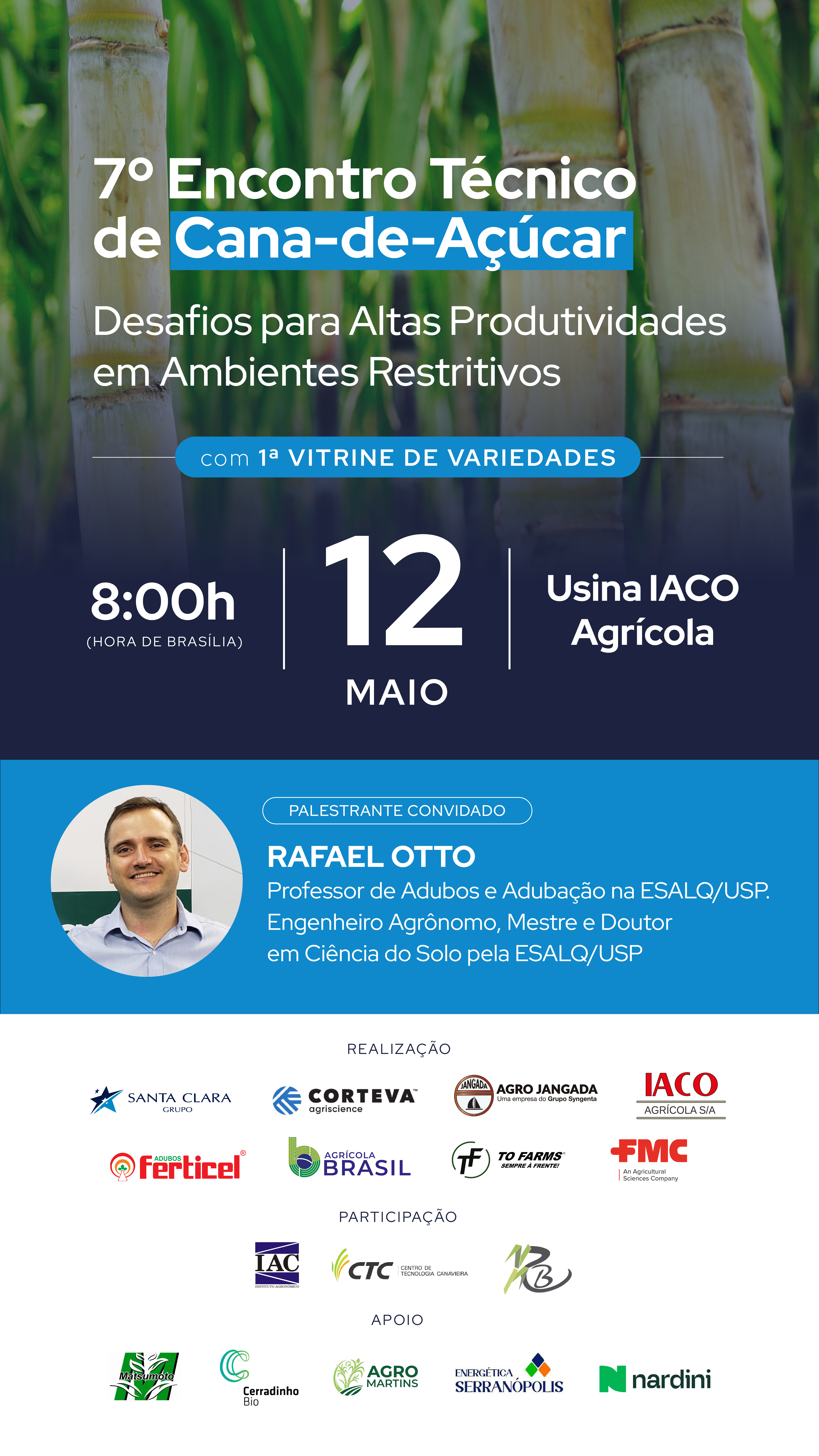 Consolidado, a cada ano, como referência por sua programação técnica e expositiva, o evento contará com palestras de Antonio Ribeiro (Ridesa), Bruno Bigotto Cabreira (CTC) e Daniel Munes (IAC), além de palestra do Prof. Dr. Rafael Otto (ESALQ/USP), uma das maiores autoridades em Ciência do Solo e Nutrição de Plantas.