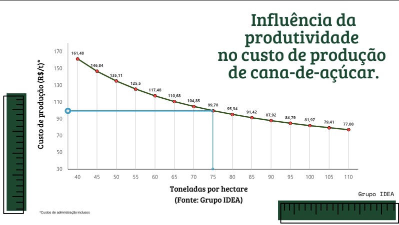 Quem produzir na casa das 100t/ha tem excelentes vantagens competitivas pois a cana vai custar R$81,97 por tonelada