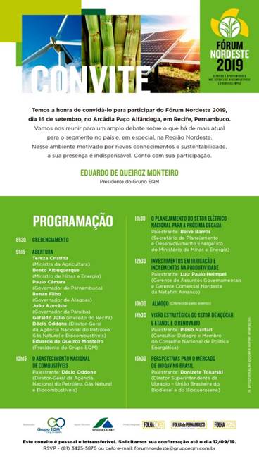 O Grupo EQM e o Sindicato da Indústria do Açúcar e do Álcool de Pernambuco (Sindaçúcar-PE), realizam, em Recife, no dia 16 de setembro, o Fórum Nordeste 2019. O evento é uma oportunidade para discussão sobre os desafios e oportunidades nos setores de biocombustíveis e energias limpas.