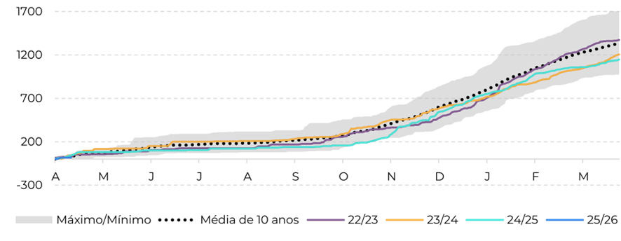 Com relação a outros fundamentos, o Brasil continua somando ao lado baixista da equação. Enquanto o mercado aguarda ansiosamente o relatório Unica de fechamento de 24/25, as chuvas voltaram ao Centro-Sul, aliviando parte do pessimismo trazido por um fevereiro seco, com melhorias em índices como o VHI (índice de saúde da vegetação). Além disso, à medida que entramos na nova temporada brasileira, os contratos futuros de açúcar podem encontrar alguma resistência a possíveis recuperações, pelo menos enquanto não houver grandes manchetes de alta.