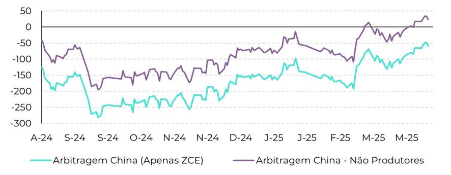 Vale a pena mencionar que, após a queda repentina dos preços do açúcar, a arbitragem de importação chinesa estimada para regiões não produtoras foi aberta. Surpreendentemente, no curto prazo, isso não foi suficiente para sustentar o adoçante, e não houve rumores de que a China estivesse fazendo novas compras. Um dos motivos pode ser o fato de que o país está particularmente envolvido nos recentes desenvolvimentos tarifários e pode ser o mais afetado por eles. A economia chinesa já estava sofrendo uma desaceleração devido a um setor imobiliário frágil, e a nova guerra comercial acrescenta outra camada de incerteza.