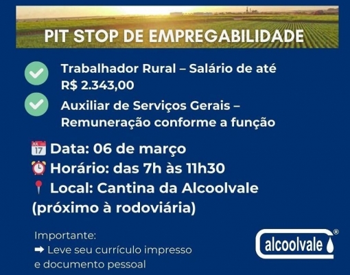 A Alcoolvale realizará, no dia 6 de março, quinta-feira, o Pit Stop de Empregabilidade, voltado para a contratação de novos colaboradores. A ação acontecerá das 7h às 11h30, na cantina da empresa, localizada próximo à rodoviária.