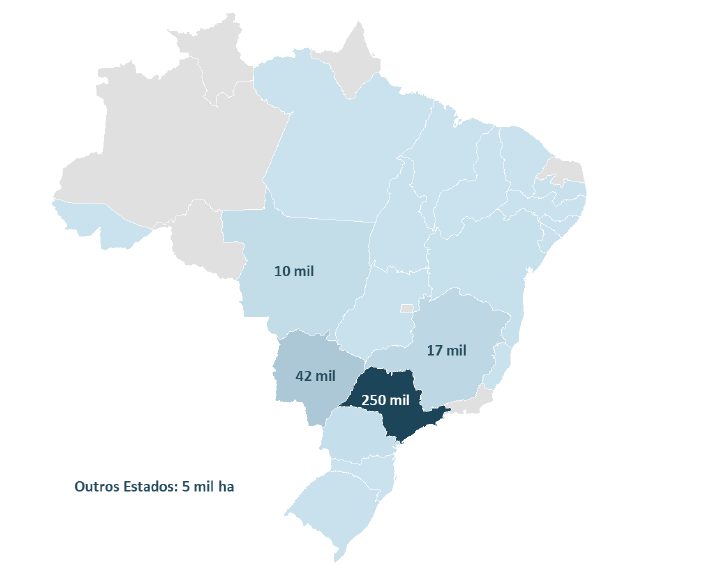 Embora os produtores paulistas ainda liderem a produção nacional com 250 mil hectares (75% do total), a expansão para outras regiões é visível. De 2018 a 2023, a produção cresceu cerca de 50% em São Paulo, mas avançou mais de 200% em Mato Grosso, 230% em Minas Gerais e Mato Grosso do Sul.