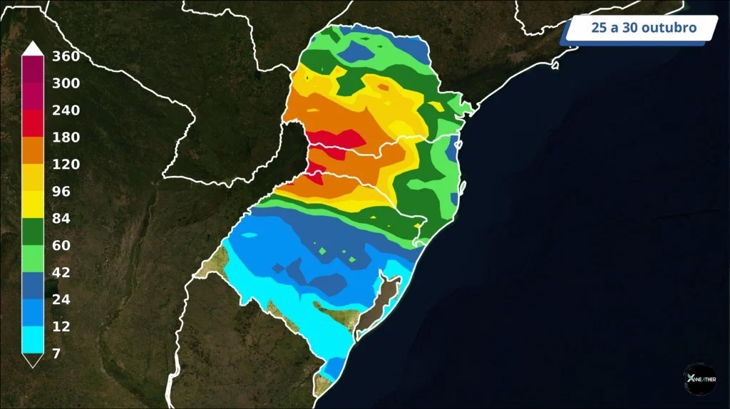 Acumulados de chuva entre esta quarta (25) e a próxima segunda-feira (30). As manchas em laranja e vermelho no nordeste do RS, centro-oeste de SC e centro-sul do PR indicam previsão de 200 mm de chuva acumulada