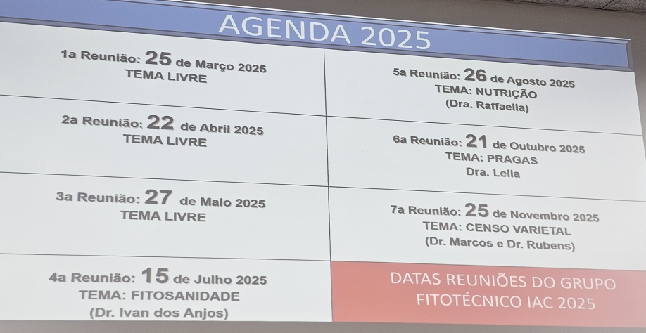 Para não haver conflito de agenda com outros eventos do setor, coordenadores do Grupo Fitotécnico já divulgaram as datas das reuniões para 2025