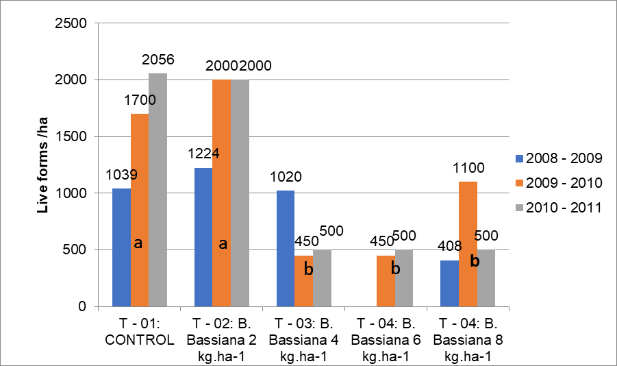 Um outro exemplo é através do fungo Beauveria bassiana para o controle da broca gigante no Nordeste. A aplicação de esporos de B. bassiana através do sistema de gotejamento provou ser bem-sucedida em doses de 4, 6 e 8 kg / ha e manteve o número de amostras de broca gigante na metade do nível não tratado.