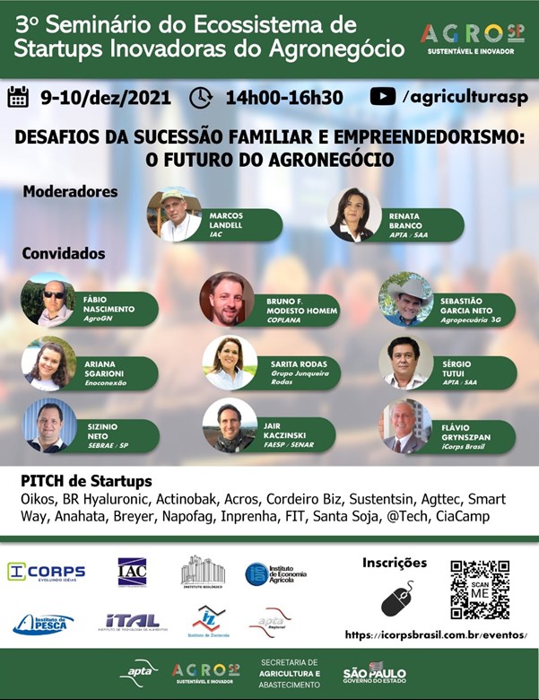 A Agência Paulista de Tecnologia dos Agronegócios (APTA), da Secretaria de Agricultura e Abastecimento do Estado de São Paulo, realizará o 3º Seminário do Ecossistema de Startups Inovadoras do Agronegócio, evento online que terá como tema central a sucessão familiar no agro. O evento acontecerá em 09 e 10 de dezembro, das 14h às 16h30, e será transmitido no canal de YouTube da Secretaria de Agricultura e Abastecimento do Estado de São Paulo. Para se inscrever clique aqui.