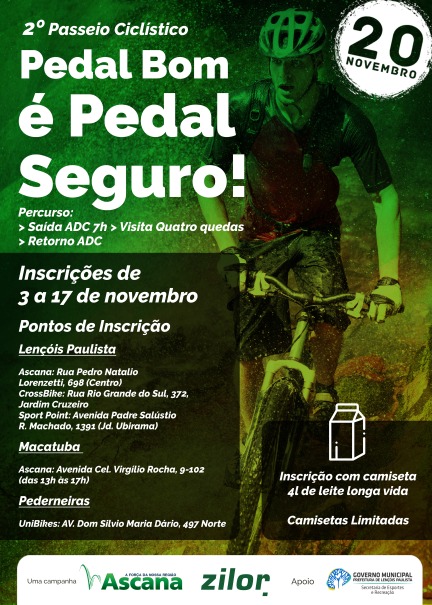 O 2º Passeio Ciclístico Pedal Bom é Pedal Seguro é uma realização da Ascana e da Zilor com o apoio da Prefeitura de Lençóis Paulista e marca o encerramento da campanha Trânsito Seguro, o aniversário de 63 anos da Associação festejado no dia 19 e o Dia do Ciclista Lençoense, comemorado no último domingo de novembro.