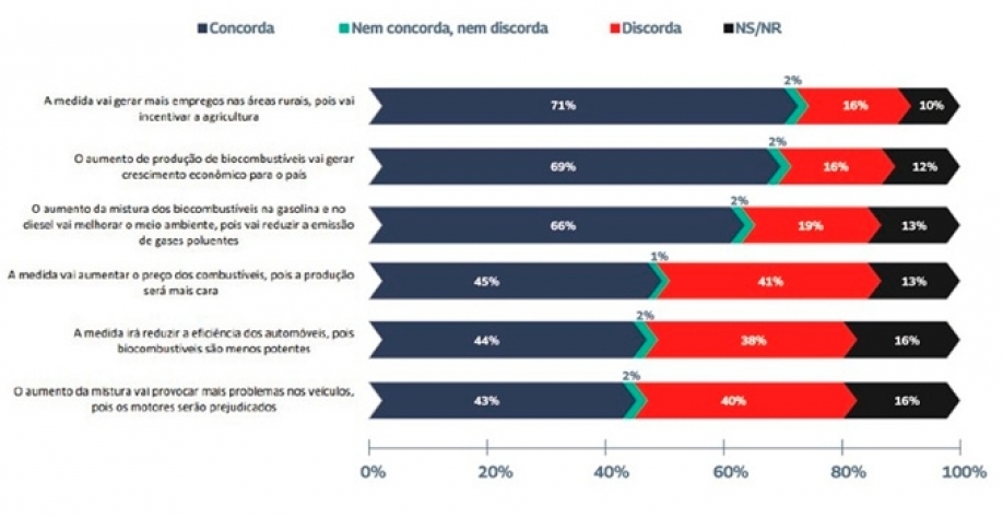 De acordo com a pesquisa da Nexus/Secom, 62% dos brasileiros acreditam, ainda, que o projeto trará benefícios para o país — seja para os consumidores, para o meio ambiente ou para ambos. Apesar disso, os entrevistados se dividem na hora de opinar sobre os possíveis problemas do aumento da porcentagem de etanol e biodiesel nos combustíveis tradicionais: 45% pensam que a novidade irá aumentar o preço nas bombas, 44% acreditam que reduzirá a eficiência dos automóveis e 43% apostam em prejuízos ao motor dos carros.