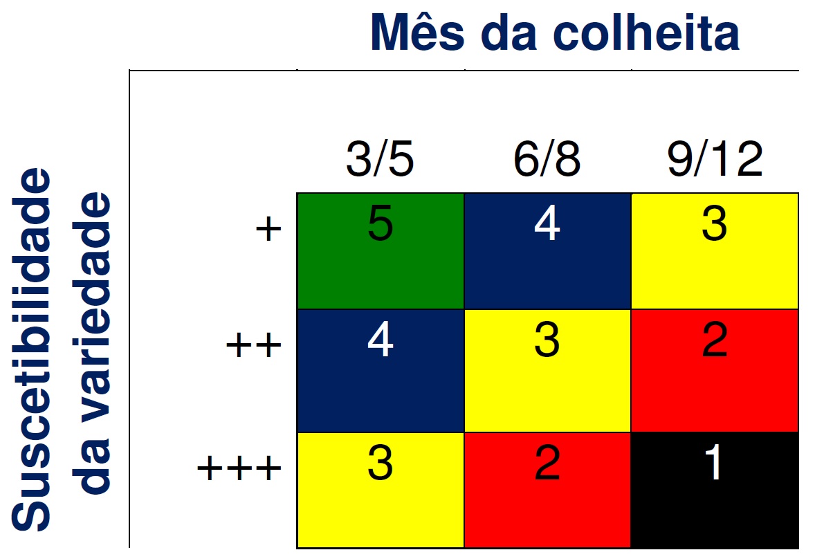 Essa matriz – composta por nove gazelas – tem como objetivo nortear os trabalhos das equipes de campo. Ela elenca as variedades e as cruza com as épocas em que foram colhidas. As amostragens e os métodos de controle das áreas localizadas nas gazelas mais inferiores (1,2 e 3) devem ser priorizadas. “Uma RB855536 colhida em outubro/novembro tem prioridade perante uma RB966928 colhida em abril/maio”, recomenda Leila.