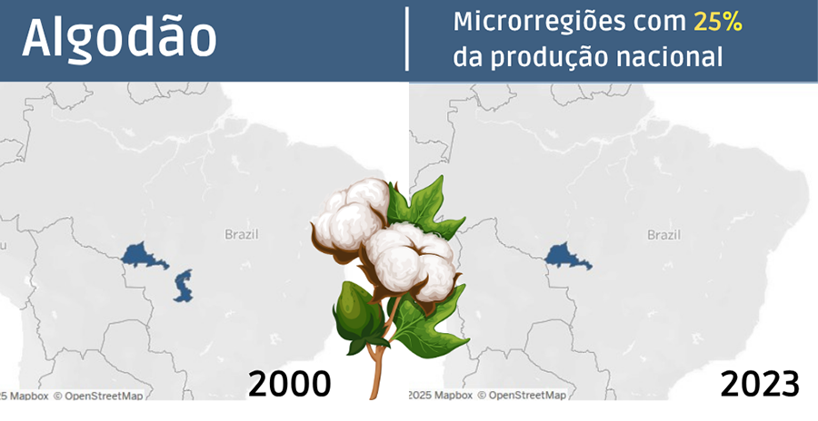 Mas nenhuma cultura é tão concentrada quanto o algodão. Em 2023, a região de Parecis (MT) respondia sozinha por 25% da produção nacional. Antes, em 2020, o G25 era dividido também com Primavera do Leste e Rondonópolis, MT – o que também mostrava alta concentração.