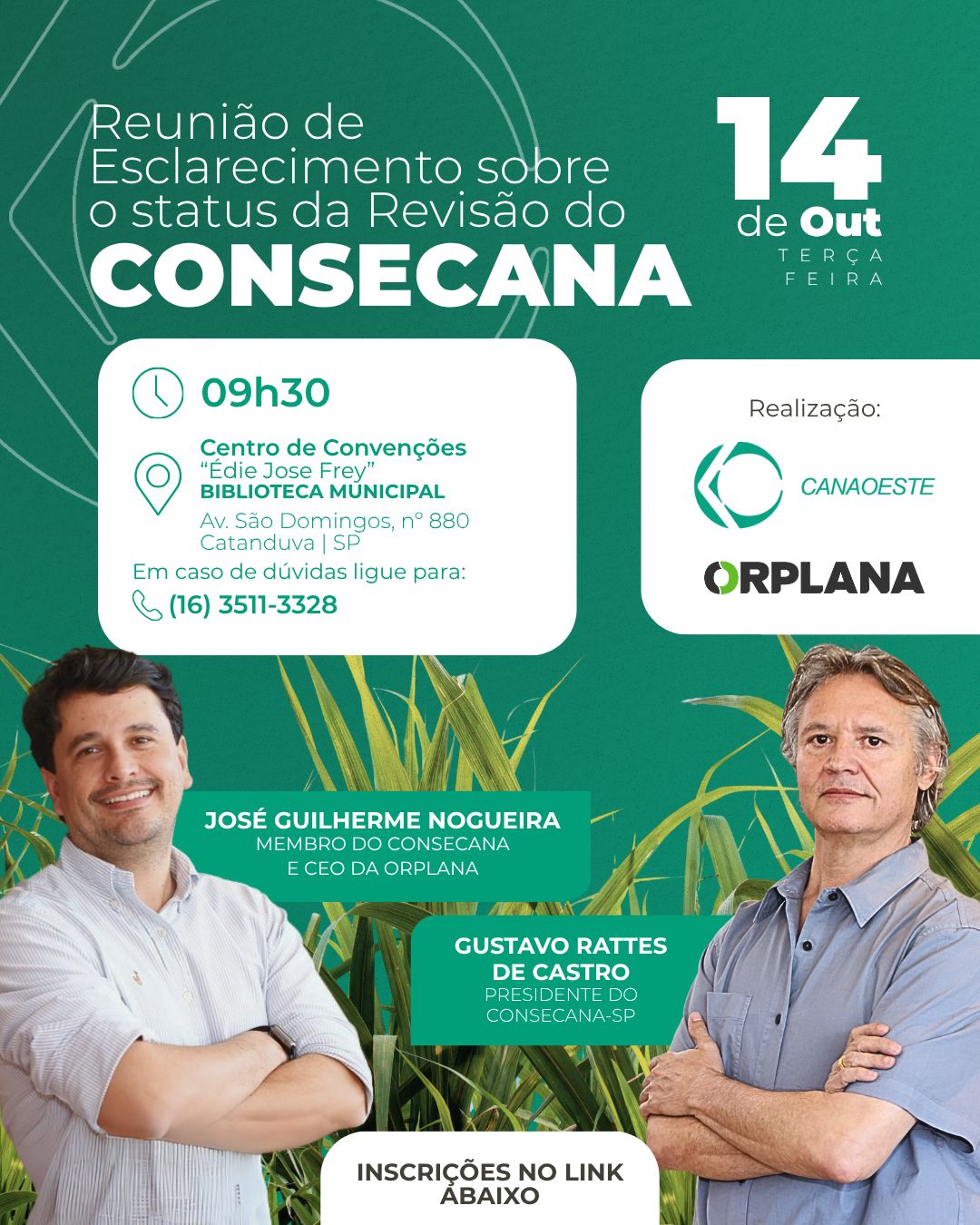 A Canaoeste, em parceria com a ORPLANA, realizará um evento de esclarecimento sobre o status da revisão do CONSECANA. O encontro ocorrerá no dia 14 de outubro, terça-feira, às 09h30, no Centro de Convenções "Édie Jose Frey", localizado na Biblioteca Municipal de Catanduva (Av. São Domingos, nº 880).