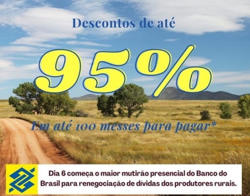 Até o próximo dia 17, o Banco do Brasil promove um mutirão de renegociação para o produtor rural pessoa física ou jurídica. Serão disponibilizadas condições especiais que incluem descontos de até 95%, para liquidação à vista de dívidas vencidas. Também estão disponíveis descontos nas taxas de juros e prazo de até 100 meses para renegociação a prazo de operações vencidas