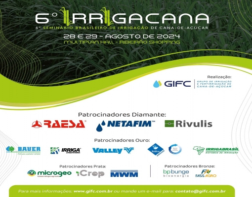Em sua sexta edição, o Seminário Brasileiro de Irrigação e Fertilização de Cana-de-Açúcar (IRRIGANA), realizado pelo GIFC (Grupo de Irrigação e Fertirrigação em Cana-de-Açúcar), reunirá representantes de unidades bioenergéticas, produtores e produtoras rurais, pesquisadores e integrantes de empresas fornecedoras do setor, para discussão e troca de informações sobre a gestão eficiente do manejo da água e da fertirrigação em canaviais, visando o aumento de produtividade agrícola e longevidade das áreas. Este ano, o seminário será realizado nos dias 28 e 29 de agosto no Multiplan Hall, do Ribeirão Shopping, espaço de eventos localizado em Ribeirão Preto/SP e considerado um dos mais modernos e inovadores do país.