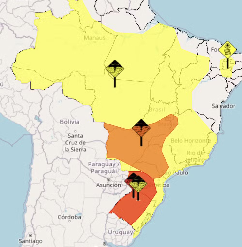 As instabilidades também atuam desde cedo no Sudeste. As chuvas ficam fortes no Estado de São Paulo, com perigo especialmente no interior, sul, leste e nordeste paulista, além do oeste de Minas Gerais e do sul e interior do Rio de Janeiro, com acumulados que podem chegar a 50 milímetros.