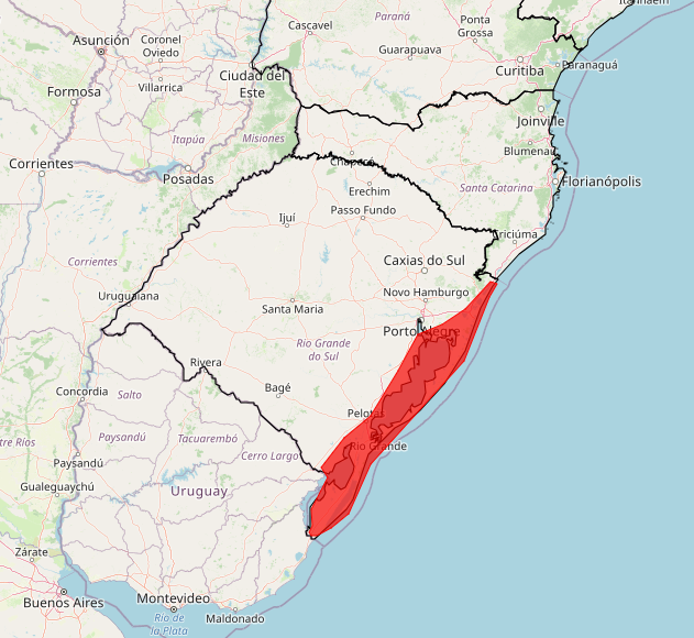 Nas demais regiões, os volumes variam entre 10 mm/dia e 80 mm/dia. As rajadas de vento oscilam entre 50 km/h e 85 km/h no território gaúcho e podem ultrapassar os 100 km/h entre o Litoral Médio e Norte e áreas próximas da Costa Doce.