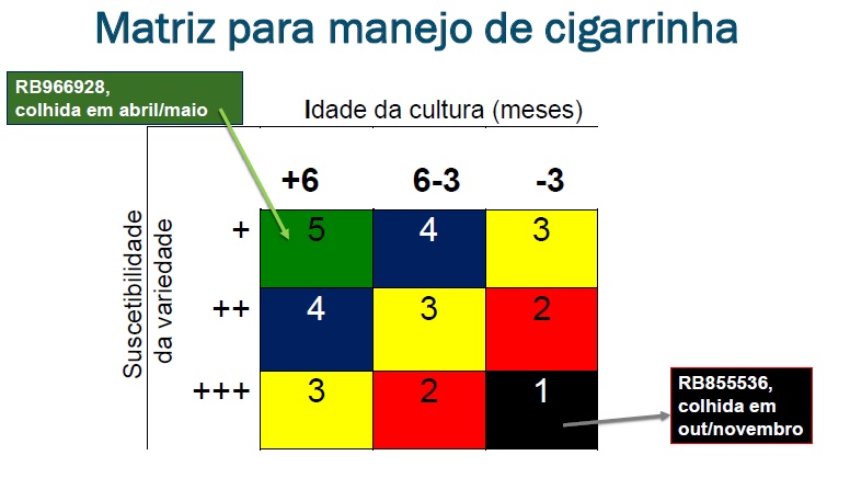 Com base nesses dados, a pesquisadora do IAC criou uma matriz de manejo e amostragem. Formado por nove caselas (com níveis de 1 a 5), a matriz tem como objetivo nortear os trabalhos das equipes de pragas das agrícolas e unidades agroindustriais. Leila explica que, quando começa o período chuvoso, as usinas devem começar a amostrar e controlar os canaviais da casela 1, que consistem em áreas colhidas no final da safra e formadas com variedades mais suscetíveis. “E assim por diante até chegar a vez das caselas 4 e 5, que tem menor necessidade de uma amostragem rigorosa e um controle tão urgente.”