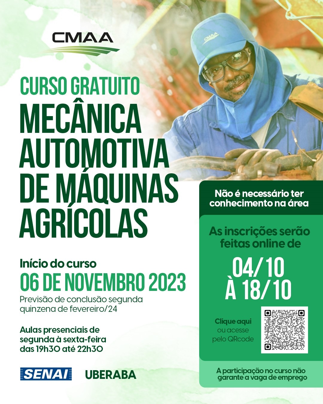 A Companhia Mineira de Açúcar e Álcool (CMAA) realiza mais um curso gratuito para a comunidade de Uberaba-MG. Como parte do seu compromisso contínuo com o desenvolvimento profissional, o curso de Mecânica Automotiva de Máquinas Agrícolas, tem início no dia 6 de novembro, e as inscrições já estão abertas.