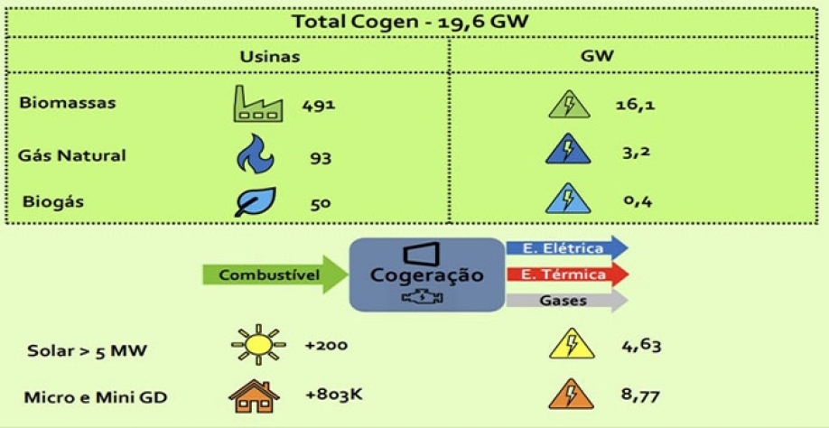 Dos 19,57 GW de toda a cogeração existente no país, 61% correspondem à produção de energia movida a biomassa de cana-de-açúcar. Já cogeração movida a gás natural ocupa uma fatia de 16,1%. Em terceiro, com 15,7%, está o licor negro (subproduto do processo de tratamento químico da indústria de papel e celulose). A cogeração derivada de cavaco de madeira chega a 4,3% e a produzida via biogás detém 1,9% Outras fontes completam o quadro.