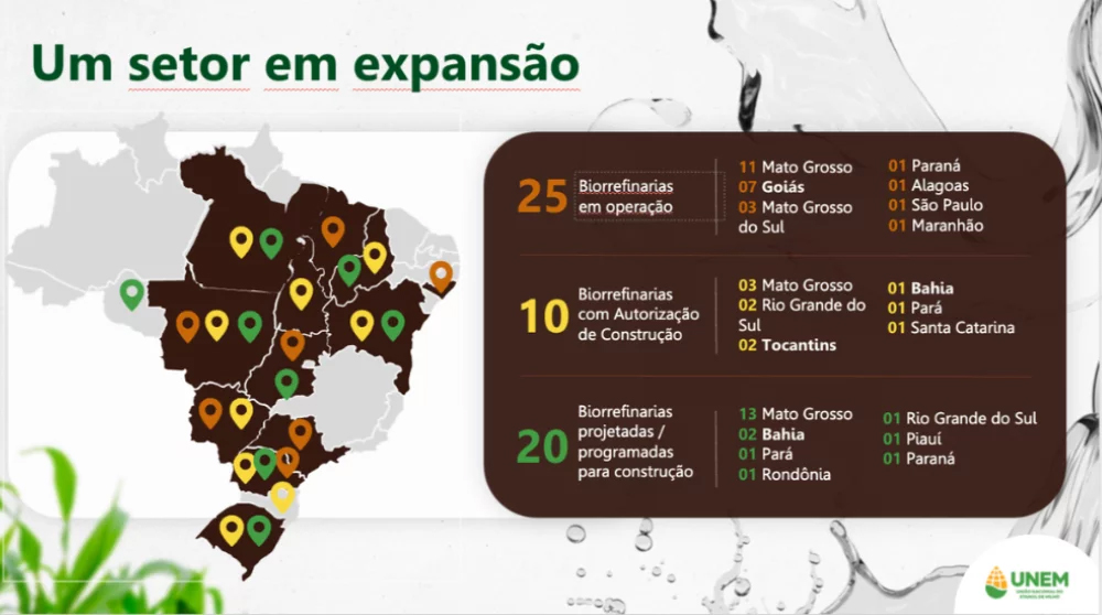 Somente no último ano, o setor respondeu por 23% da produção nacional de etanol, com mais de oito bilhões de litros gerados por ano. Atualmente, o país conta com 25 biorrefinarias em operação. Outras dez já têm autorização de construção, enquanto outros 20 novos projetos estão programados, conforme levantamento da Unem.