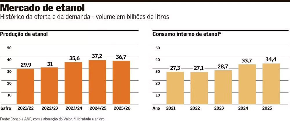 No ano passado, quando o consumo do ciclo Otto (gasolina e etanol) foi recorde, as vendas totais de etanol — somando o hidratado vendido nos postos e o anidro misturado à gasolina — alcançaram cerca de 34 bilhões de litros. Em 2026, o consumo do ciclo Otto deve ter um aumento na faixa entre 1,6 bilhão e 1,9 bilhão de litros em gasolina equivalente, segundo estimativa recente da consultoria Datagro. Se todo esse acréscimo for garantido pelo etanol hidratado, trata-se de um consumo adicional de 2,3 bilhões de litros.