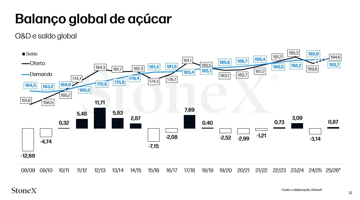 Segundo os cálculos da StoneX, há um excedente de 870 mil toneladas de açúcar na safra 2025/2026. “Caso se confirme esse cenário de troca de mix do açúcar para o etanol, esse superávit global, que é bem pequeno, volta pra déficit novamente. Aí podemos ver os preços voltarem a subir”, analisa Nogueira ao apresentar os dados durante o 19º Congresso Internacional de Indústrias Abimapi. O movimento de plantas brasileiras rumo ao mix mais alcooleiro possível poderia tirar 2 milhões de toneladas do mercado.