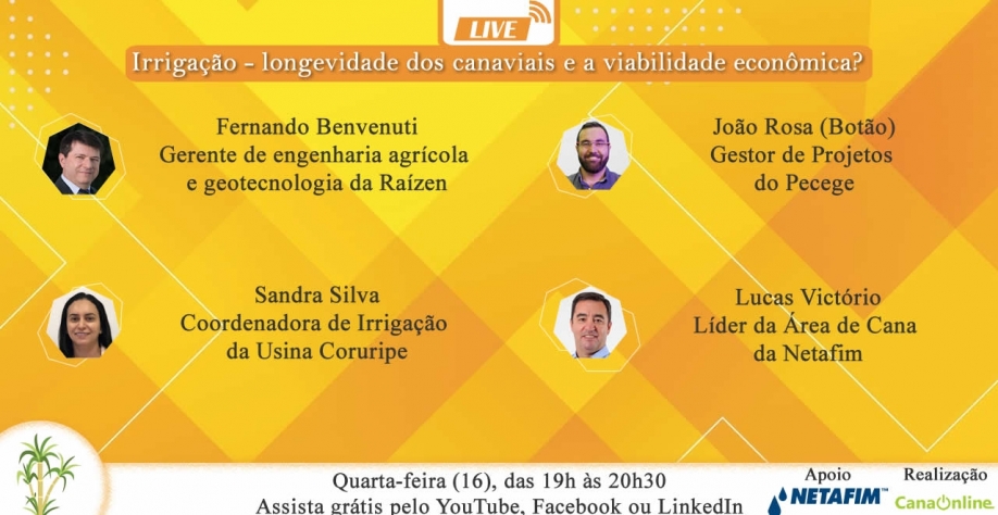 Confira os links para acompanhar a live: Irrigação - longevidade dos canaviais e a viabilidade econômica