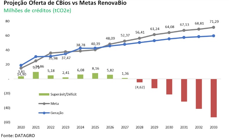 Tomando como base a projeção de crescimento de 2,2% da demanda de combustíveis do ciclo Otto, e de 2,8% na de diesel, a DATAGRO prevê que a geração de CBios alcançará 42,46 milhões em 2025, totalizando uma oferta total de 59,01 milhões de créditos ao considerar o estoque inicial de 16,55 milhões de CBios; ou seja, 8,16 milhões de créditos acima da meta geral de 2025, de 50,85 milhões de CBios (soma da meta base de 40,39 milhões de CBios com a quantidade não aposentada em 2024, de 10,46 milhões de CBios).
