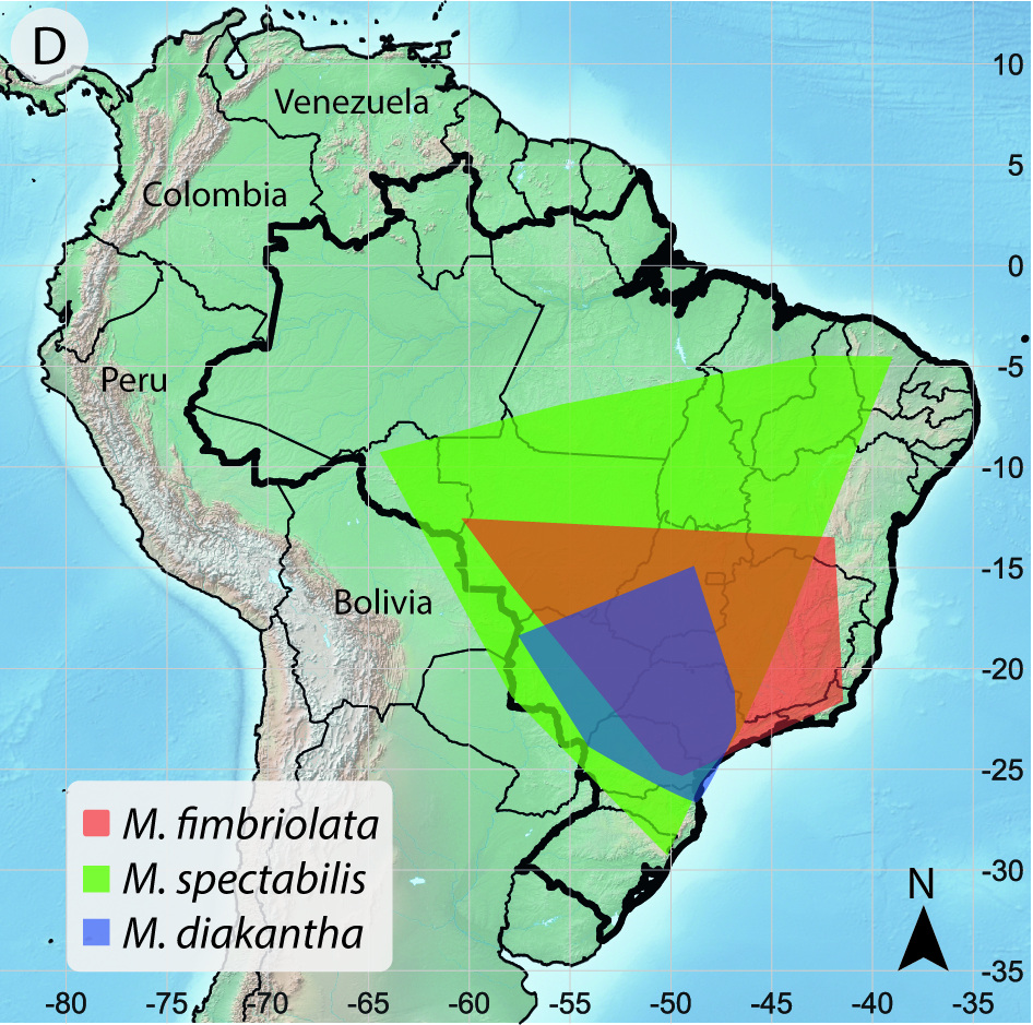 Mapa de distribuição das três espécies e área de intersecção entre elas