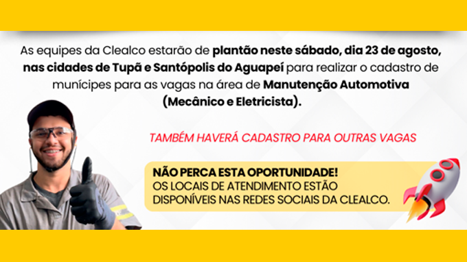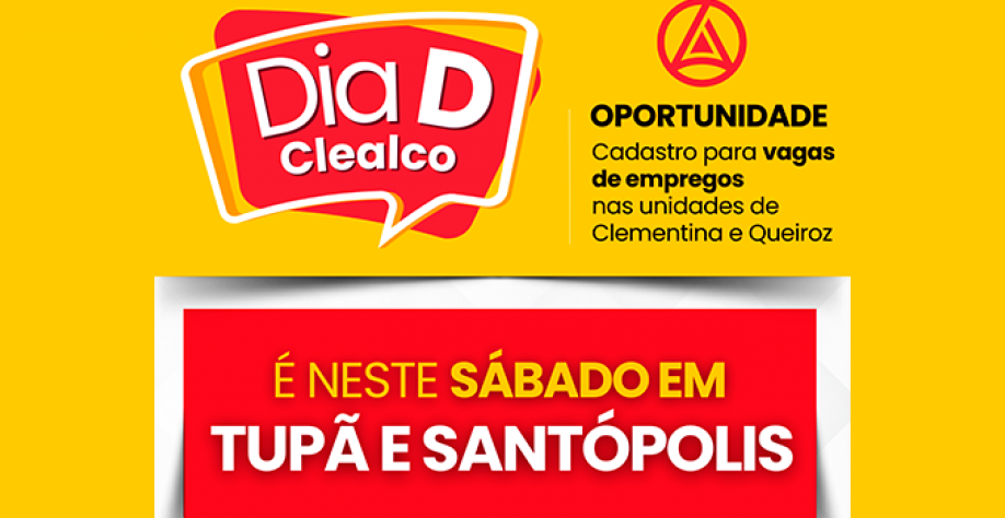 No próximo sábado, dia 23 de agosto, a Clealco realizará o “Dia D” nas cidades de Tupã e Santópolis do Aguapéi, das 8h às 12h. Durante a ação, munícipes poderão de cadastrar para as vagas abertas na área de Manutenção Automotiva, que estão com contratação imediata nas duas unidades da empresa, localizadas nos municípios de Clementina e Queiroz.