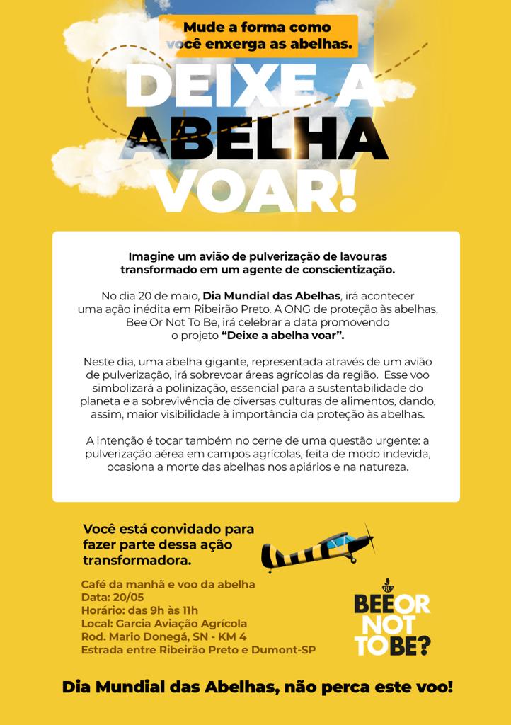 Neste próximo dia 20 de maio, sexta-feira, data mundial em defesa das Abelhas, a ONG Bee or not to be promove uma ação inédita de divulgação da causa com um voo de um avião agrícola nos céus de Ribeirão Preto e região.