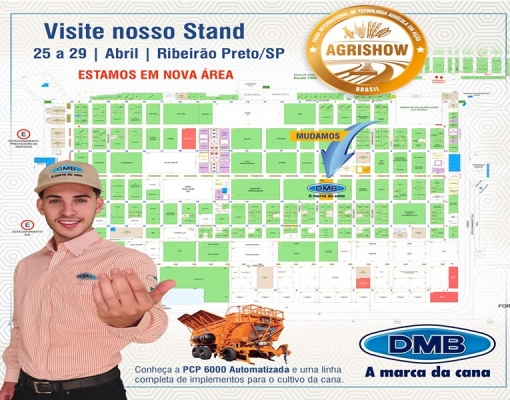 A DMB Máquinas e Implementos Agrícolas, a marca da cana, ocupa novo endereço na Agrishow 2022, a principal feira de tecnologia agrícola da América Latina, que acontecerá, presencialmente, de 25 e 29 de abril, no município paulista de Ribeirão Preto.