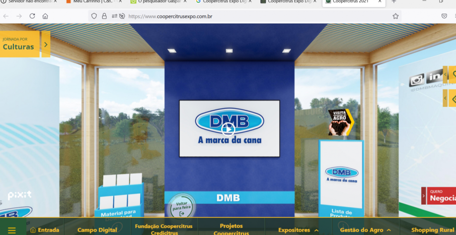 A DMB participa também da jornada da cana, que é uma das novidades da Coopercitrus Expo Digital 2021. Os organizadores do evento criaram jornadas específicas para diversas culturas e temas. Durante a navegação, o visitante pode percorrer as diferentes fases de desenvolvimento da cultura, identificando problemas e buscando soluções técnicas, inclusive as disponibilizadas pelos expositores de produtos e serviços por meio de material informativo (imagens, vídeos, textos).