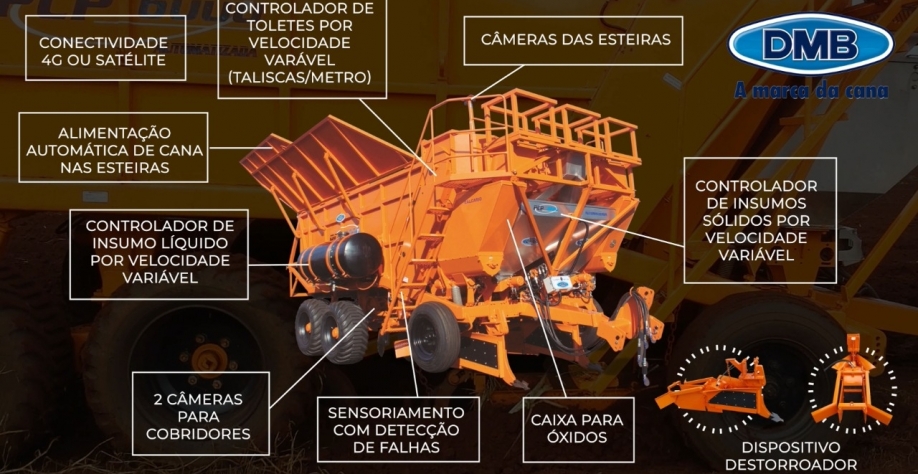 Já sulcador com dispositivo destorroador possibilita que essa plantadora da DMB desempenhe outra função importante: o aprimoramento do preparo do solo. Com haste que pode atingir uma profundidade de até quarenta centímetros, esse recurso da máquina automatizada elimina ondulações no terreno e torrões, criando condições adequadas para a melhoria da brotação e do perfilhamento da cana, redução de falhas no canavial e diminuição da quantidade de mudas utilizadas no plantio.