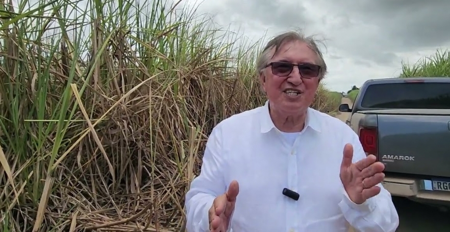 Ainda no vídeo, Edilson mostra a diferença entre a cana irrigada por gotejo ao lado de uma cana de sequeiro.