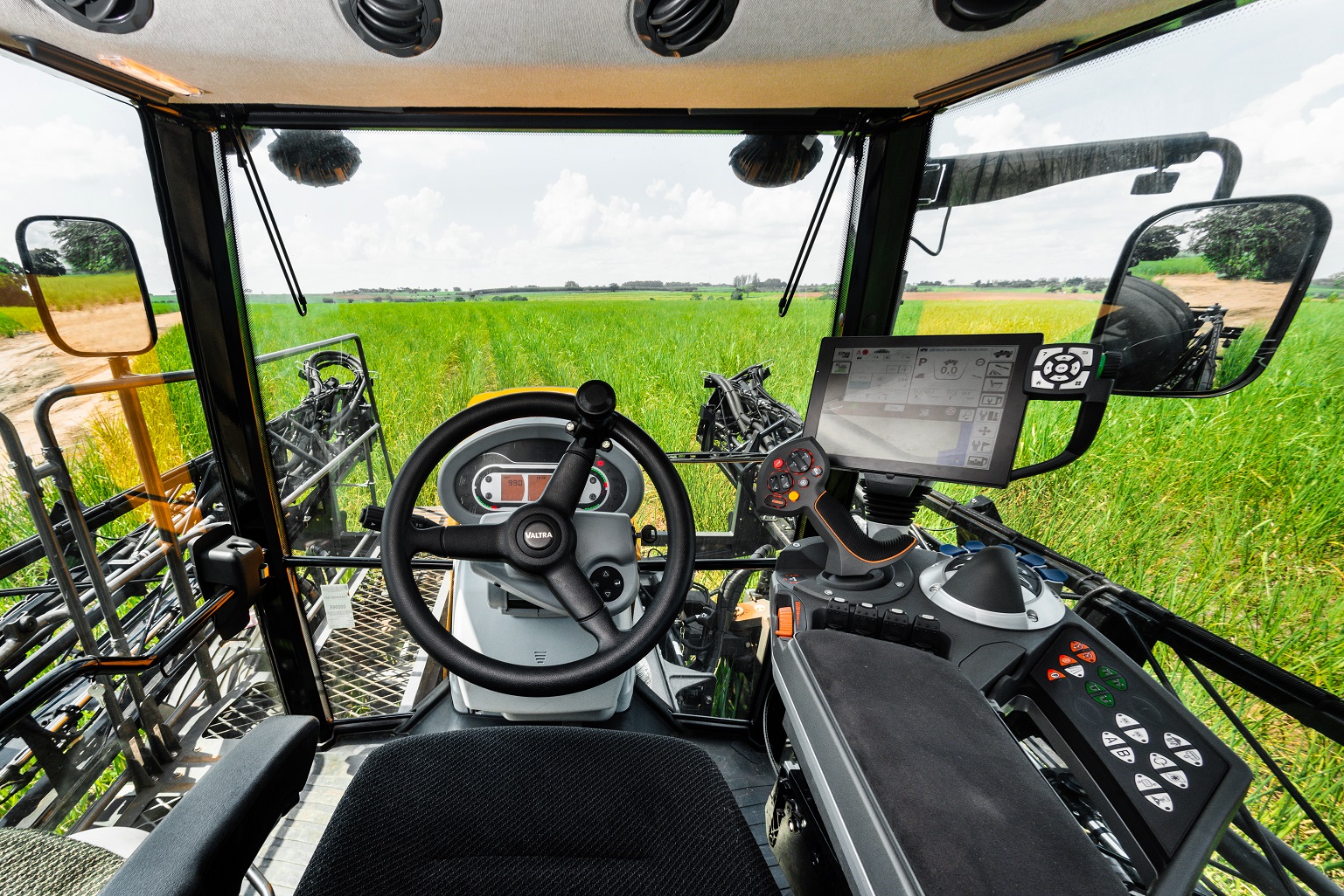 A cabine centralizada, com ampla visibilidade da barra e do rastro, também contribui para o conforto e a performance do operador, sobretudo em culturas como a cana, que exigem longas jornadas e alta rotatividade de profissionais. Todos os comandos de manobras de cabeceira estão reunidos em um só botão, com automação de tarefas como piloto automático, pulverização e ajuste de barra.