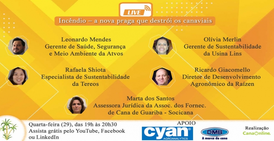 Os danos provocados pelos incêndios será um dos temas da live: “Incêndio – a nova praga que destrói os canaviais” – que a CanaOnline realiza em 29 de junho, das 19h00 às 20h30 e terá transmissão simultânea pelo YouTube, Facebook e Linkedin