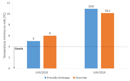 Nos anos anteriores, a Embrapa previu que as temperaturas mínimas não seriam suficientes para configurar condições favoráveis a ocorrência de geadas. Essas previsões foram confirmadas e não tivemos geadas em junho (confira no gráfico lateral). Nos dois anos anteriores, 2018 e 2019, as previsões se diferenciaram da temperatura mínima ocorrida em no máximo 1 ºC.