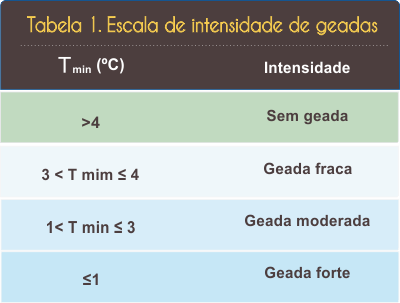Com índice de confiança de 95%, o sistema é capaz de prever em dezembro, qual a temperatura mínima que deverá ocorrer em junho, no Sul de Mato Grosso do Sul. Baseando-se nessa temperatura prevista e na escala de intensidade de geadas (tabela abaixo), é possível informar qual a probabilidade de ocorrer geada e com qual intensidade.