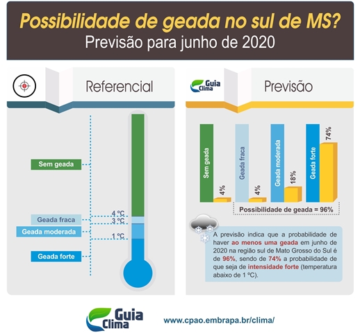 A Embrapa Agropecuária Oeste, através do seu sistema de previsão de geada, alerta que existe alta probabilidade de ocorrer geada forte no mês de junho de 2020, em municípios da região sul de Mato Grosso do Sul. Segundo a Embrapa Agropecuária Oeste, a probabilidade de ocorrer ao menos uma geada é de 96%. Além disso, existe 74% de probabilidade de que essa geada seja classificada como forte, ou seja, ocorra em condições de temperatura abaixo de 1ºC (veja imagem abaixo).