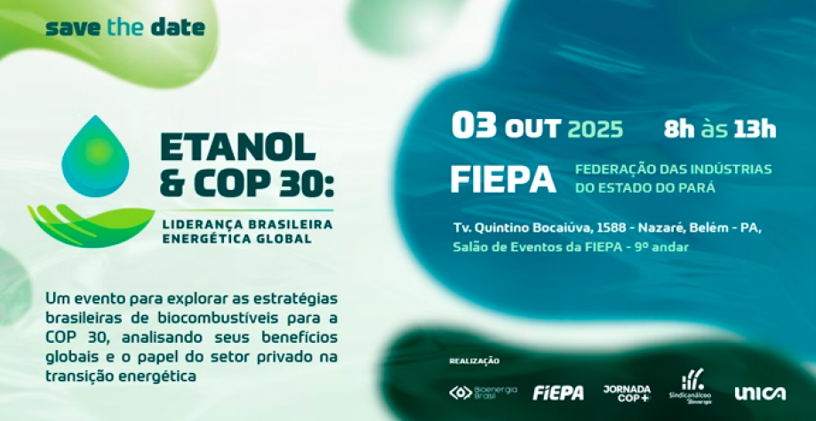 A Bioenergia Brasil, a Federação das Indústrias do Estado do Pará (FIEPA), o Sindicato da Indústria de Fabricação de Etanol do Estado do Pará (Sindicanálcool) e a União da Indústria de Cana-de-Açúcar e Bioenergia (UNICA) realizarão em Belém, no dia 03 de outubro, o encontro “Etanol & COP30: Liderança Brasileira Energética Global”.