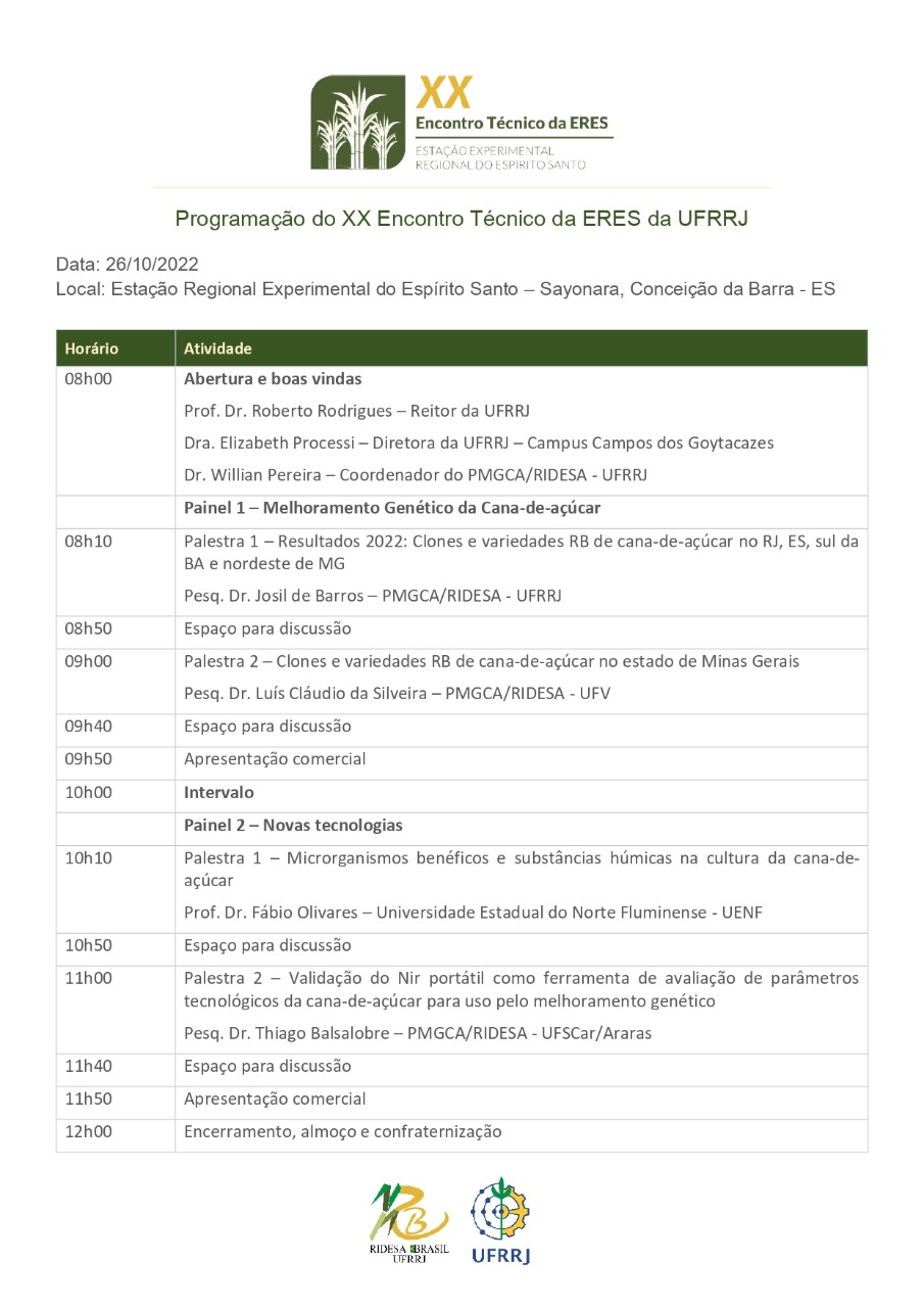 O evento terá a presença de profissionais da área agrícola de usinas e unidades produtoras de cana do Rio de Janeiro, Espírito Santo, sul da Bahia e nordeste de Minas Gerais. E contará com a participação de especialistas e pesquisadores de programas de melhoramento genético de universidades federais que desenvolvem trabalhos voltados para a produção de cana-de-açúcar nesses estados e regiões.
